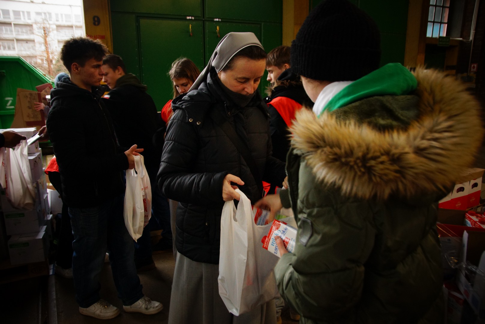 Dzień wcześniej w hali starej zajezdni tramwajowej na Dąbiu paczki zostały przygotowane, przez wolontariuszy Caritas i żołnierzy Wojsk Obrony Terytorialnej.