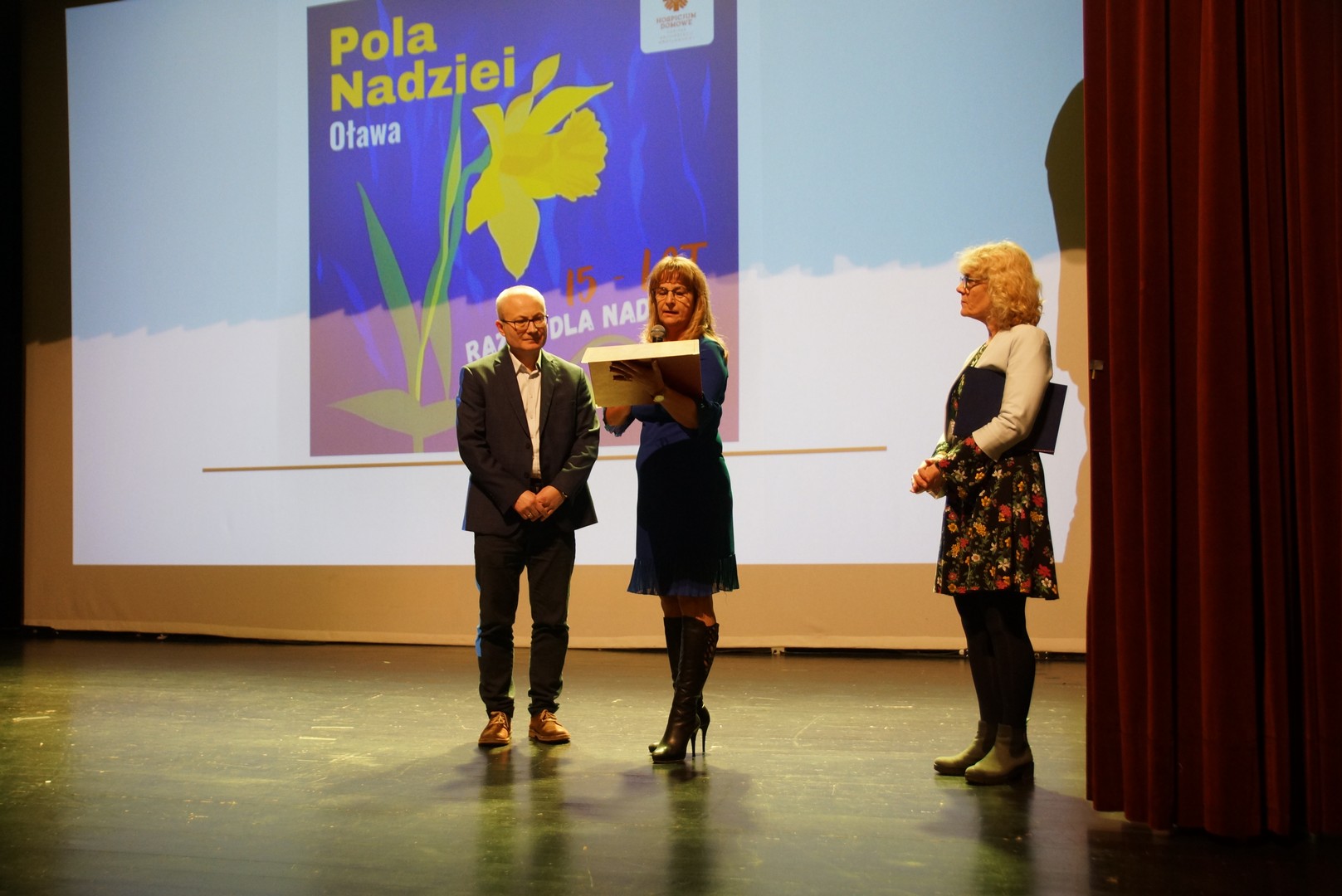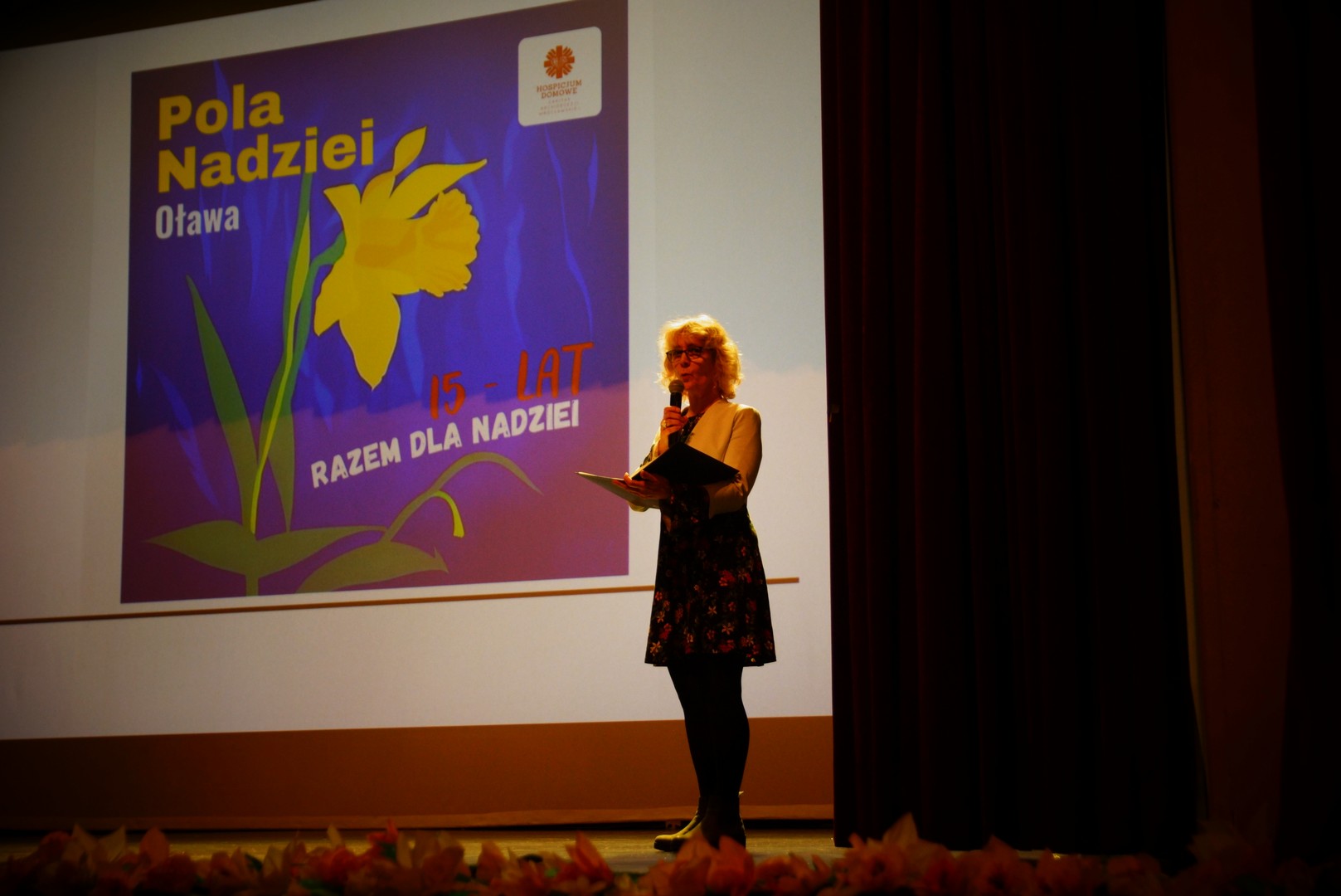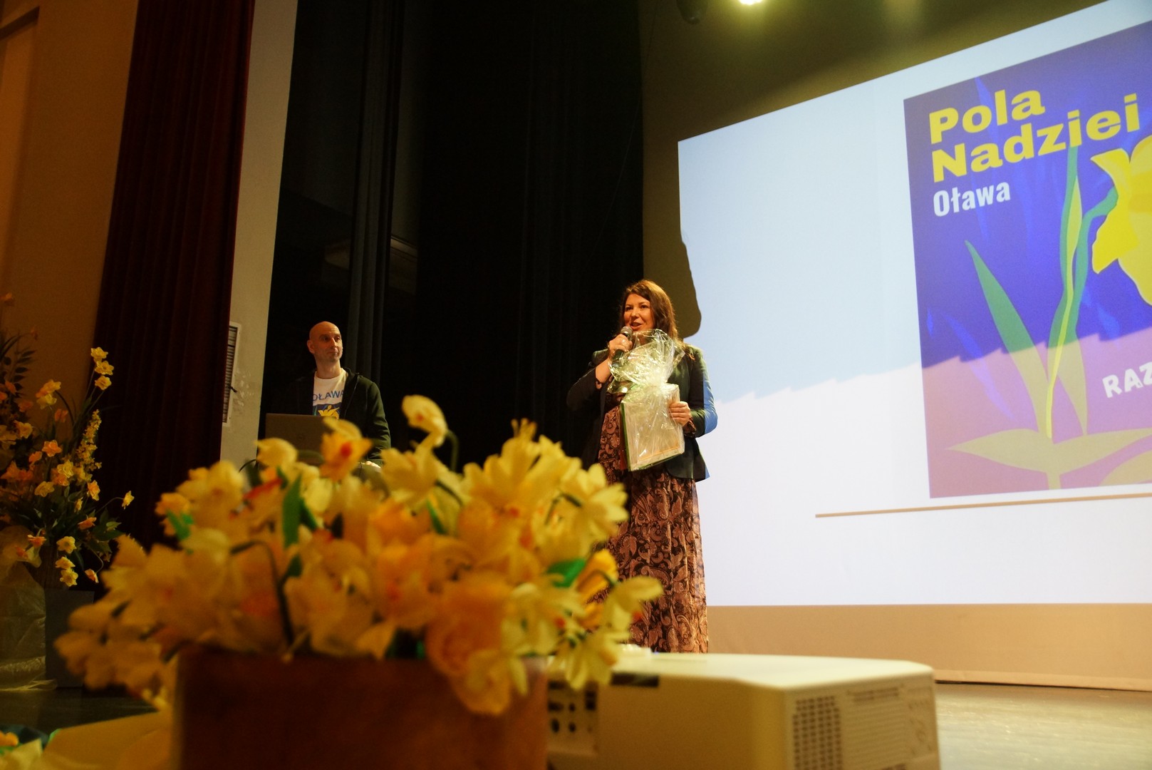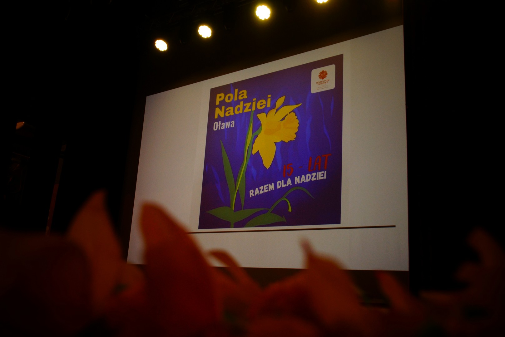 Scena oławskiego Centrum Sztuki przyozdobiona została ręcznie wykonanymi żonkilami – symbolem nadziei i troski. Jak podkreślił ks. Dariusz Amrogowicz, dyrektor wrocławskiej Caritas najpiękniejsze żonkile to te, które zebrane na widowni, które niosą radość, dobro i ciepło, widoczne w sercach młodych zaangażowanych w Pola nadziei. – Gratuluję Wam, że nie boicie się rozmawiać o cierpieniu, chorobie i śmierci – aspektach wpisanych w nasze ludzkie życie. Pokazujecie, jak wielką wartość ma dobro, które szczególnie pomaga tym, którzy przeżywają trudne chwile- mówił ksiądz Amrogowicz.