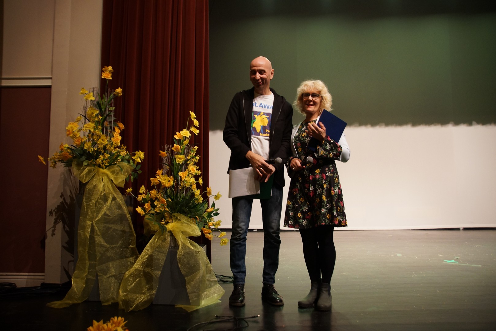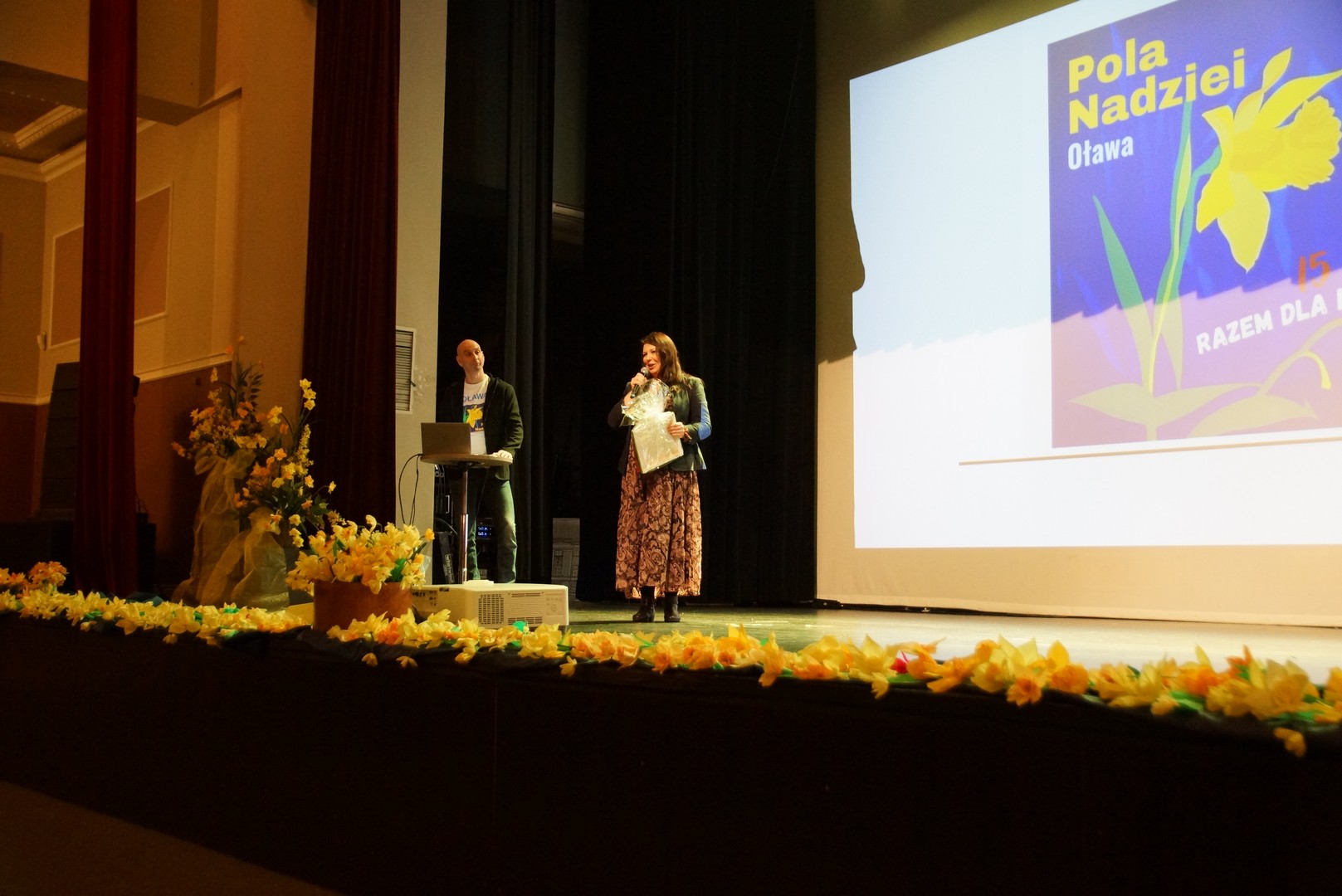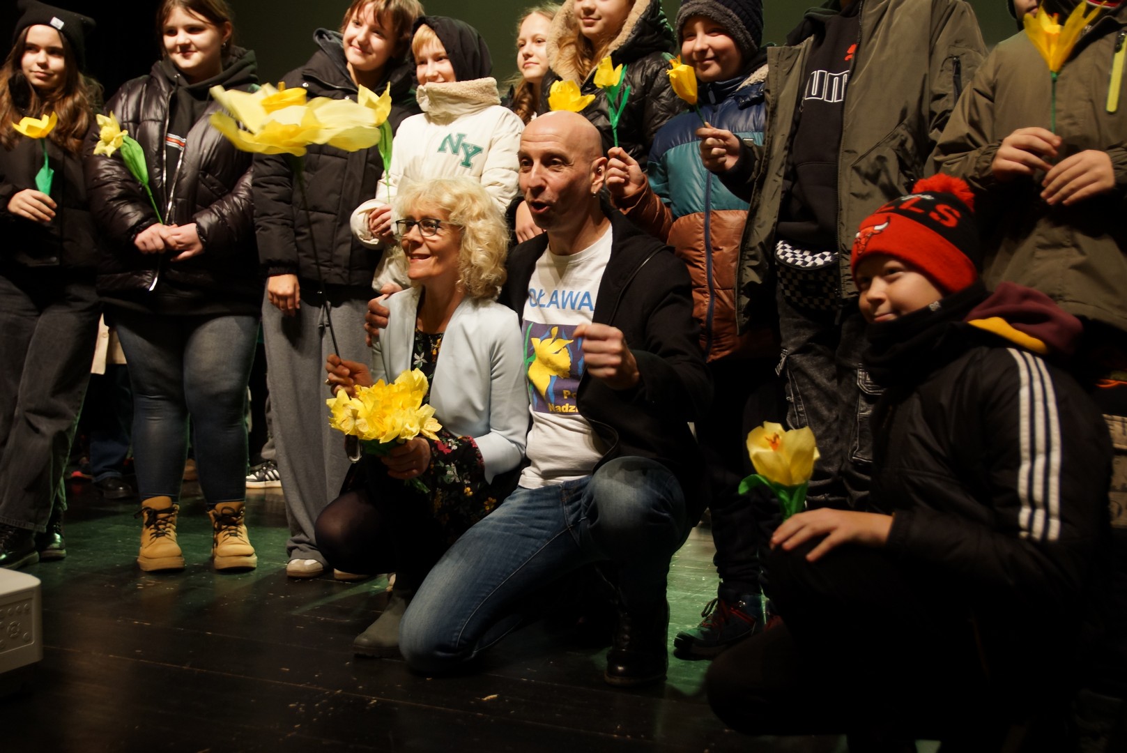 Scena oławskiego Centrum Sztuki przyozdobiona została ręcznie wykonanymi żonkilami – symbolem nadziei i troski. Jak podkreślił ks. Dariusz Amrogowicz, dyrektor wrocławskiej Caritas najpiękniejsze żonkile to te, które zebrane na widowni, które niosą radość, dobro i ciepło, widoczne w sercach młodych zaangażowanych w Pola nadziei. – Gratuluję Wam, że nie boicie się rozmawiać o cierpieniu, chorobie i śmierci – aspektach wpisanych w nasze ludzkie życie. Pokazujecie, jak wielką wartość ma dobro, które szczególnie pomaga tym, którzy przeżywają trudne chwile- mówił ksiądz Amrogowicz.