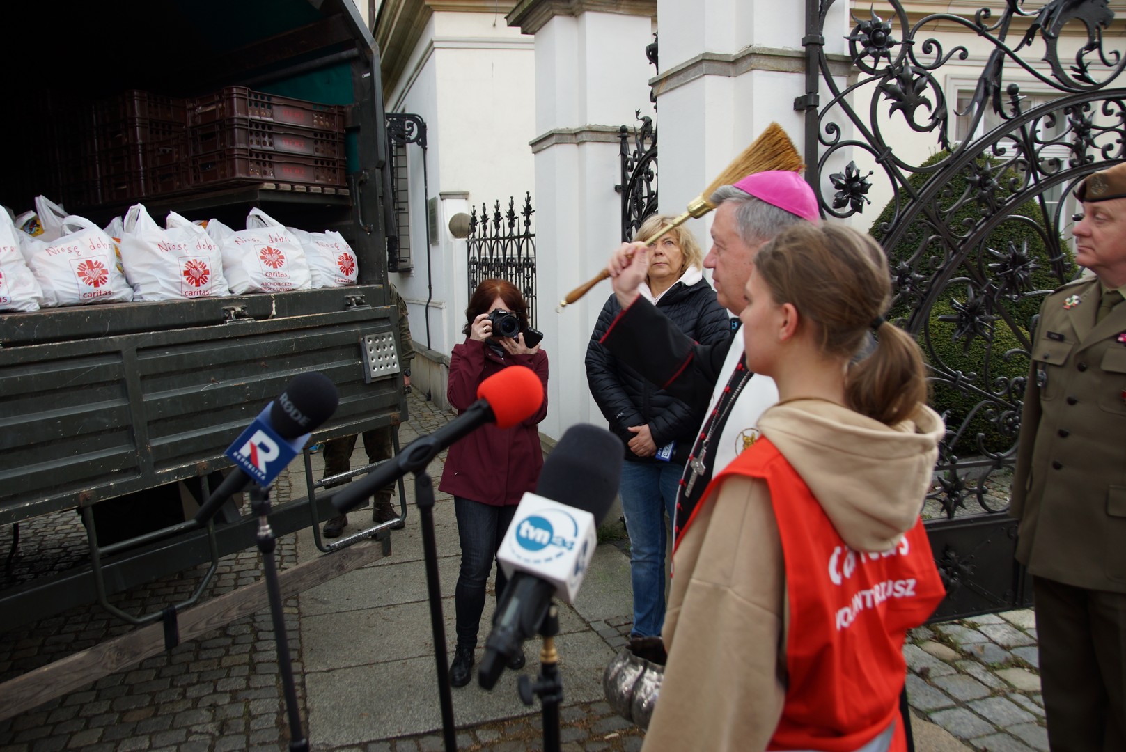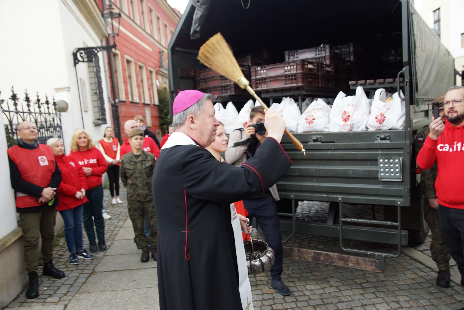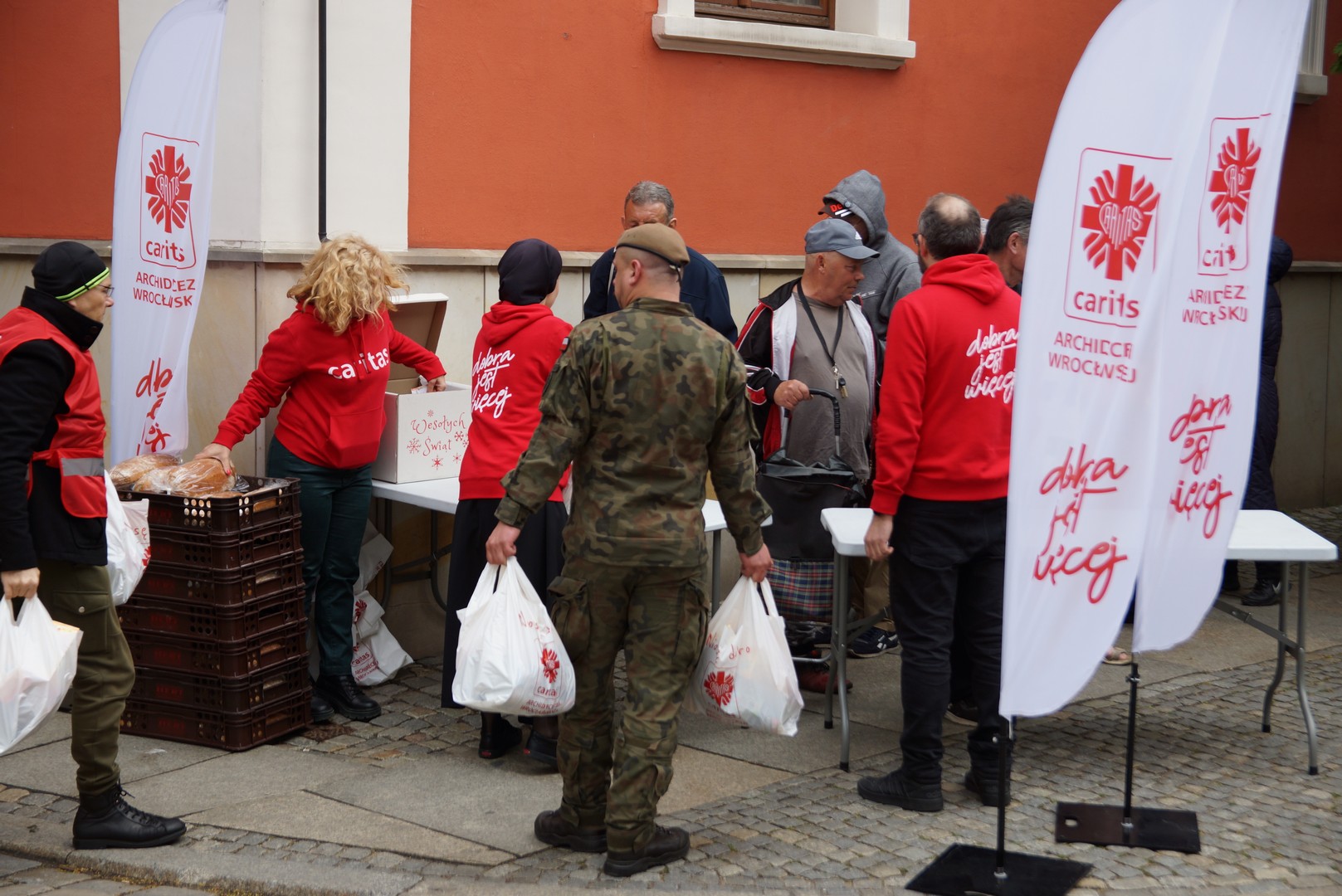 Metropolita wrocławski abp Józef Kupny pobłogosławił paczki na stoły najuboższych wrocławian, a chwilę później wolontariusze Caritas oraz żołnierze 16. Dolnośląskiej Brygady Obrony Terytorialnej rozdali je potrzebującym.