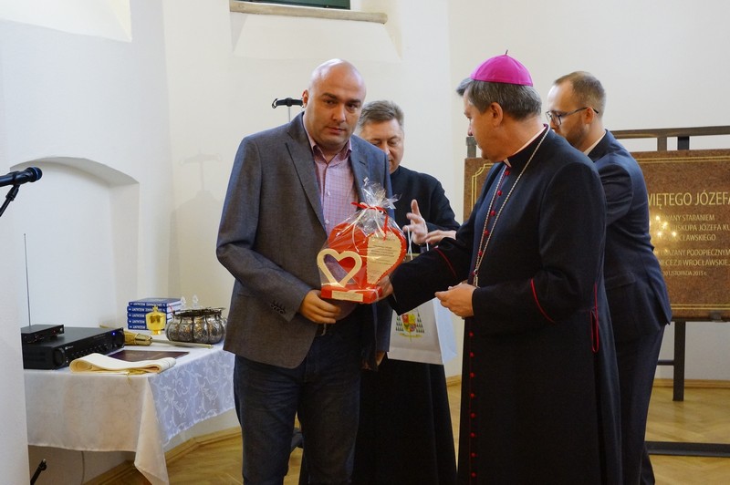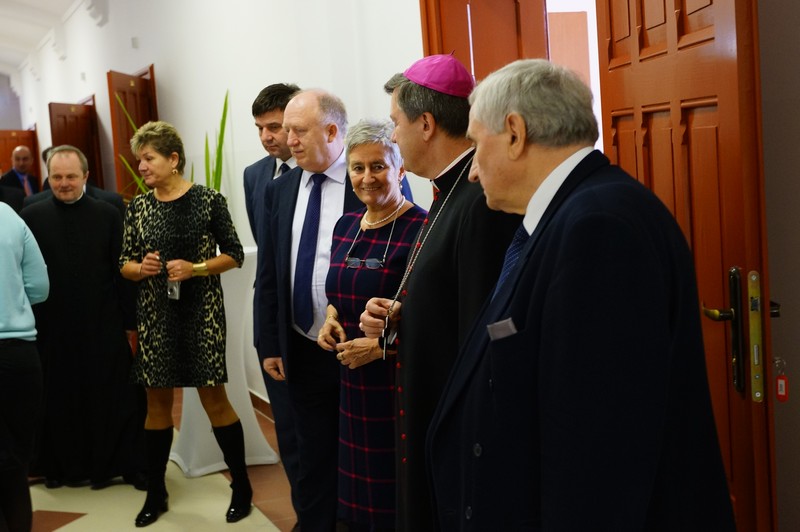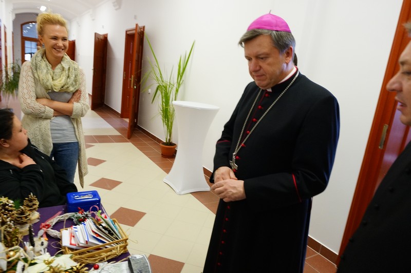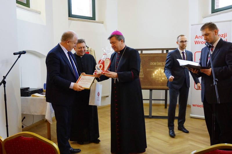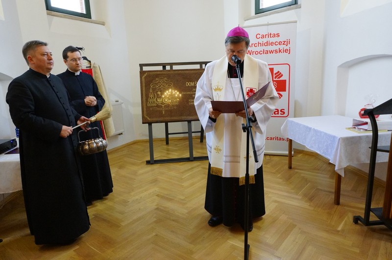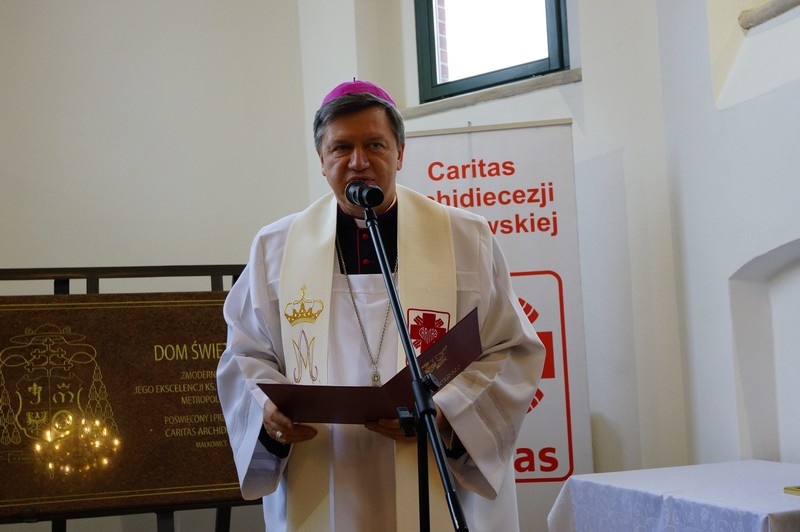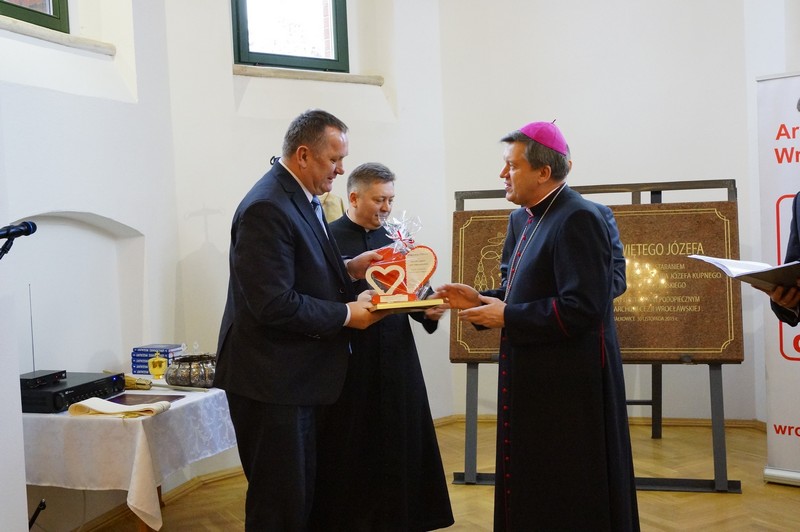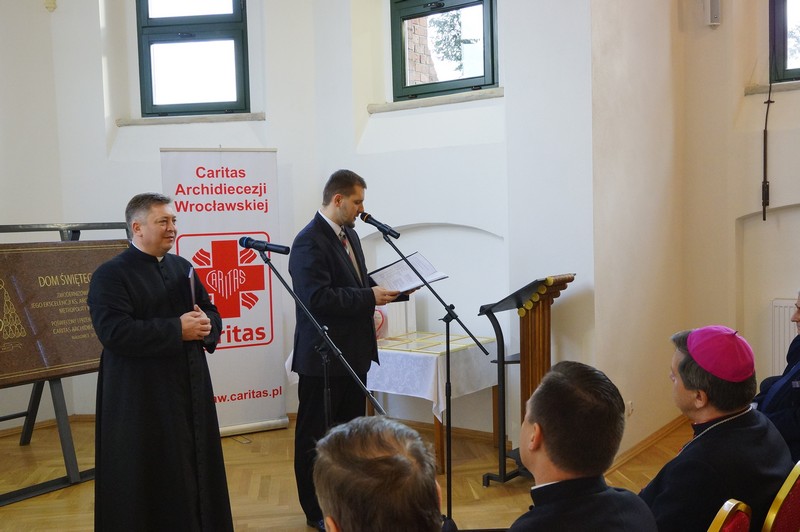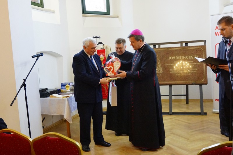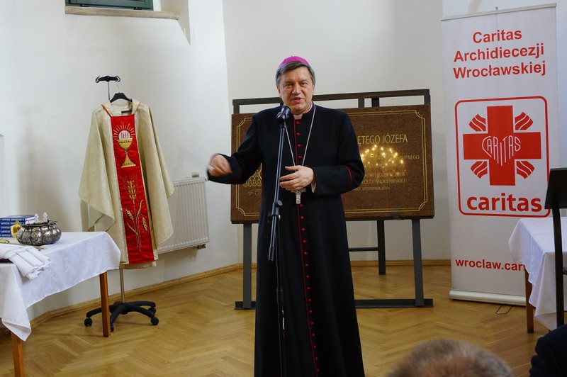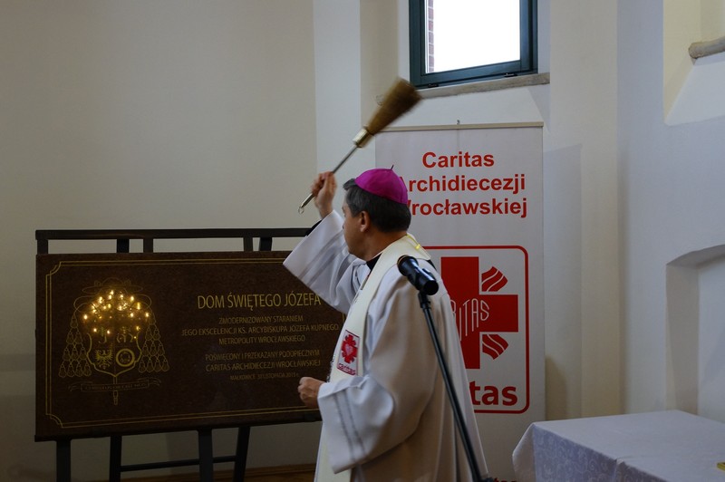 Druga część uroczystości związana była z poświęceniem i nadaniem patrona całemu zespołowi placówek Caritas w Małkowicach. Ks. abp Józef Kupny, który był gospodarzem tej uroczystości, wręczył pamiątkowe podziękowania i symboliczne upominki strategicznym Partnerom. Odebrali je Herbert Wirth, Prezes Zarządu KGHM Polska Miedź S.A., oraz Marek Bestrzyński, Prezes Zarządu Fundacji KGHM Polska Miedź, Marcin Sokołowski, Dyrektor Oddziału Państwowego Funduszu Rehabilitacji Osób Niepełnosprawnych, Oddział Dolnośląski, oraz Antoni Kopeć, Burmistrz Miasta i Gminy Kąty Wrocławskie. Podziękowania otrzymał również prof. Wojciech Witkiewicz. W przemówieniu ks. abp Józef Kupny wskazał na św. Józefa jako doskonałego patrona dla wszelkich dzieł, w których pokorna służba jest istotą działania na rzecz chorych i cierpiących. Podkreślił potrzebę istnienie tego miejsca jako elementarnej części działalności Kościoła. Słowo Boże, liturgia i posługa miłosierdzia – Caritas, te trzy elementy stanowią o tożsamości Kościoła. Dziękując wszystkim przyjaciołom Caritas, ksiądz arcybiskup podzielił się swoim odczuciem, że ten budynek nie mógł się marnować i być wykorzystywany tylko w pewnej części, dlatego tak bardzo zależało mu na szybkim zakończeniu prac modernizacyjnych. Zrobiłem, co mogłem, ale sami byśmy tego nie udźwignęli – mówił do strategicznych partnerów, kierując swe podziękowania w stronę Fundacji KGHM Polska Miedź i Urzędu Marszałkowskiego. Dla upamiętnienia tego wydarzenia Metropolita Wrocławski poświęcił pamiątkową tablicę, a cały dom i wszystkich w nim pracujących i przebywających powierzył troskliwej opiece św. Józefa. Na zakończenie uczestnicy uroczystości zostali oprowadzeni po obiekcie. W przewodnika wcielił się kierownik Warsztatu Terapii Zajęciowej, Marcin Seretny, który na każdej z kondygnacji uchylał drzwi i opowiadał o szczegółach działalności poszczególnych jednostek Caritas.