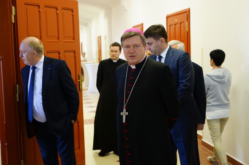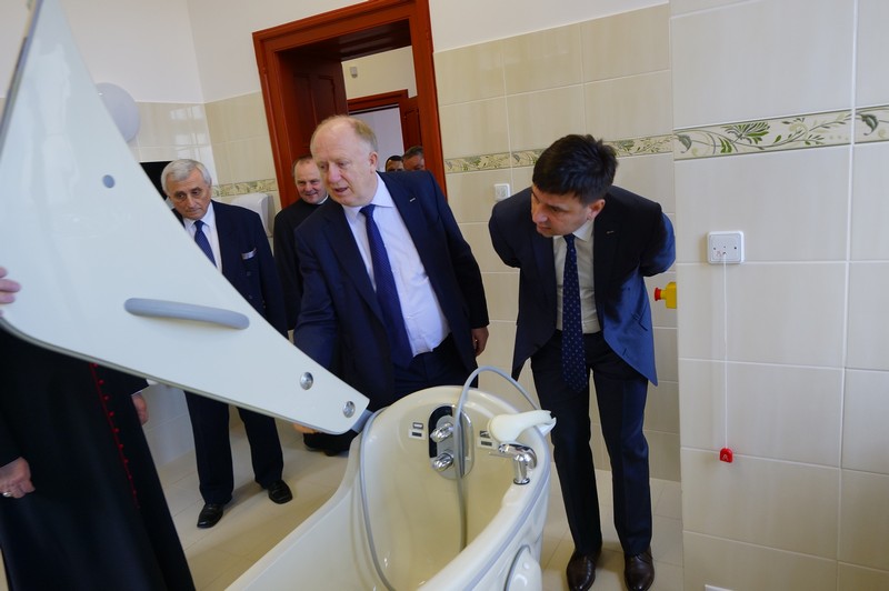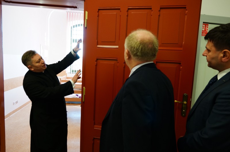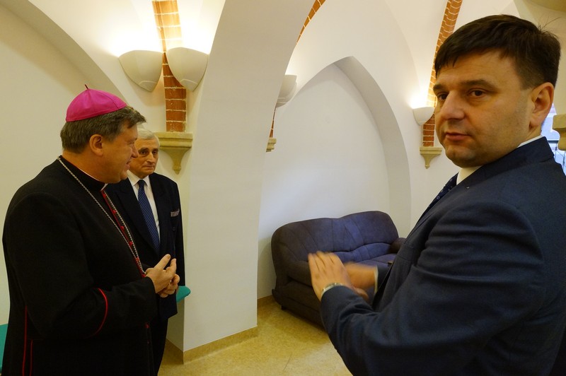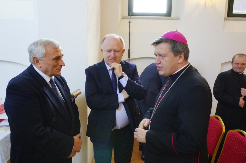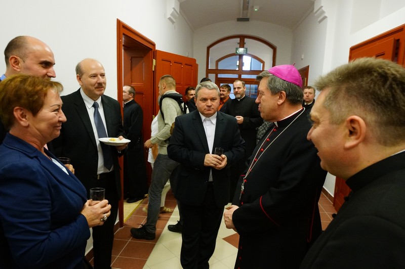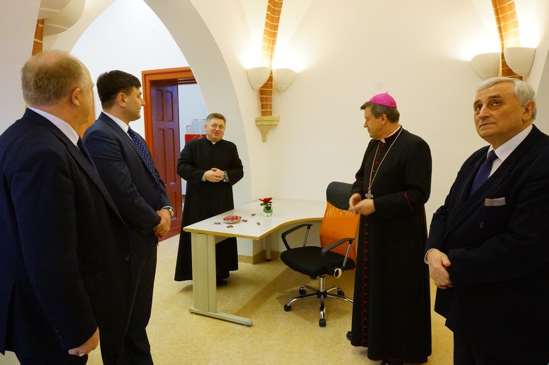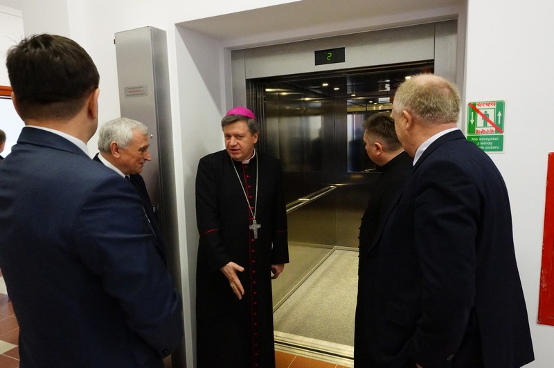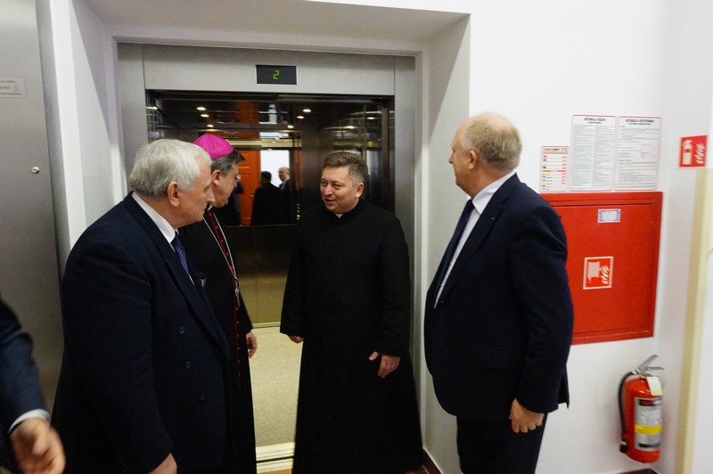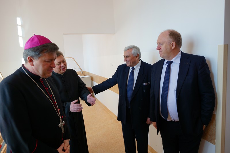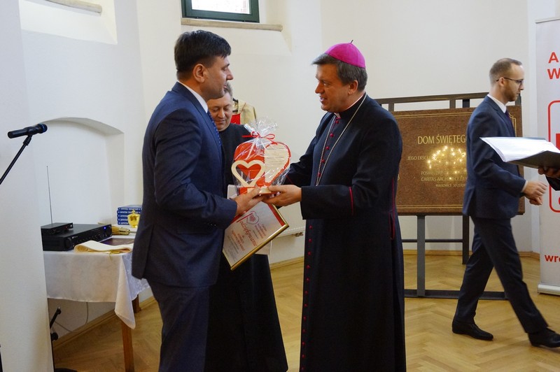 Druga część uroczystości związana była z poświęceniem i nadaniem patrona całemu zespołowi placówek Caritas w Małkowicach. Ks. abp Józef Kupny, który był gospodarzem tej uroczystości, wręczył pamiątkowe podziękowania i symboliczne upominki strategicznym Partnerom. Odebrali je Herbert Wirth, Prezes Zarządu KGHM Polska Miedź S.A., oraz Marek Bestrzyński, Prezes Zarządu Fundacji KGHM Polska Miedź, Marcin Sokołowski, Dyrektor Oddziału Państwowego Funduszu Rehabilitacji Osób Niepełnosprawnych, Oddział Dolnośląski, oraz Antoni Kopeć, Burmistrz Miasta i Gminy Kąty Wrocławskie. Podziękowania otrzymał również prof. Wojciech Witkiewicz. W przemówieniu ks. abp Józef Kupny wskazał na św. Józefa jako doskonałego patrona dla wszelkich dzieł, w których pokorna służba jest istotą działania na rzecz chorych i cierpiących. Podkreślił potrzebę istnienie tego miejsca jako elementarnej części działalności Kościoła. Słowo Boże, liturgia i posługa miłosierdzia – Caritas, te trzy elementy stanowią o tożsamości Kościoła. Dziękując wszystkim przyjaciołom Caritas, ksiądz arcybiskup podzielił się swoim odczuciem, że ten budynek nie mógł się marnować i być wykorzystywany tylko w pewnej części, dlatego tak bardzo zależało mu na szybkim zakończeniu prac modernizacyjnych. Zrobiłem, co mogłem, ale sami byśmy tego nie udźwignęli – mówił do strategicznych partnerów, kierując swe podziękowania w stronę Fundacji KGHM Polska Miedź i Urzędu Marszałkowskiego. Dla upamiętnienia tego wydarzenia Metropolita Wrocławski poświęcił pamiątkową tablicę, a cały dom i wszystkich w nim pracujących i przebywających powierzył troskliwej opiece św. Józefa. Na zakończenie uczestnicy uroczystości zostali oprowadzeni po obiekcie. W przewodnika wcielił się kierownik Warsztatu Terapii Zajęciowej, Marcin Seretny, który na każdej z kondygnacji uchylał drzwi i opowiadał o szczegółach działalności poszczególnych jednostek Caritas.