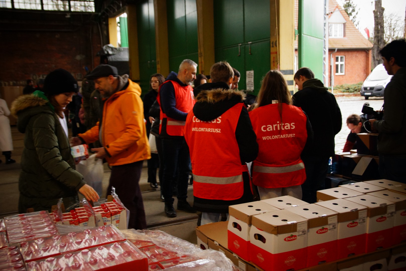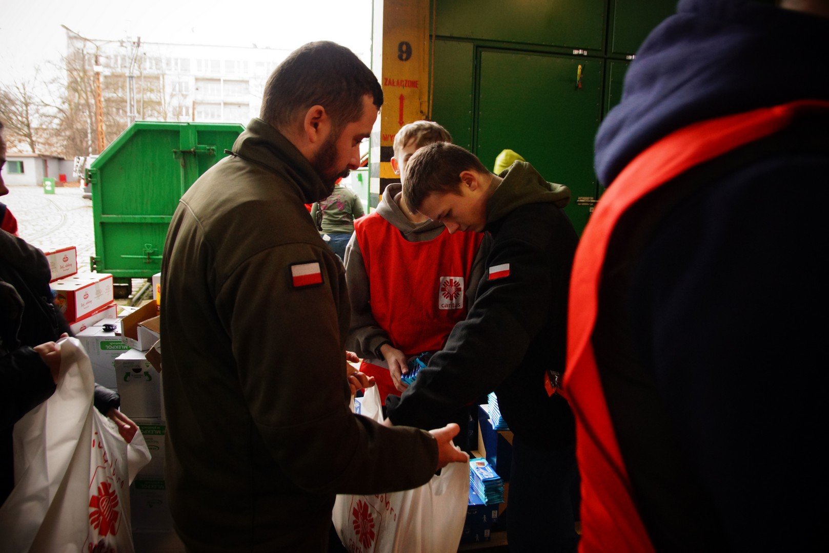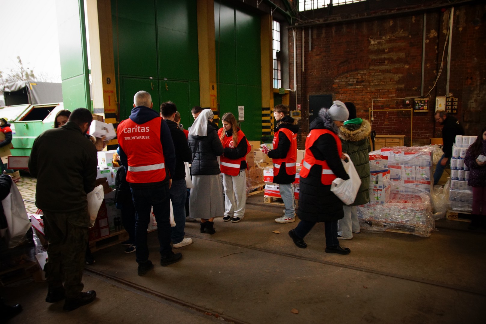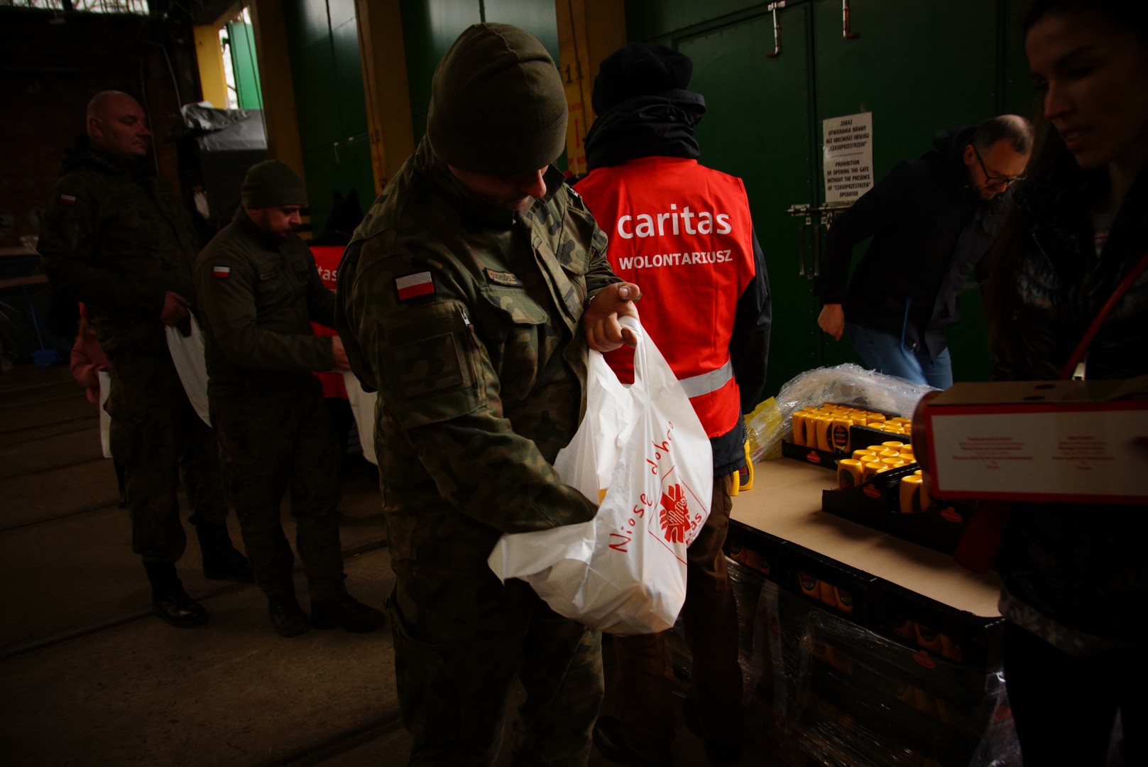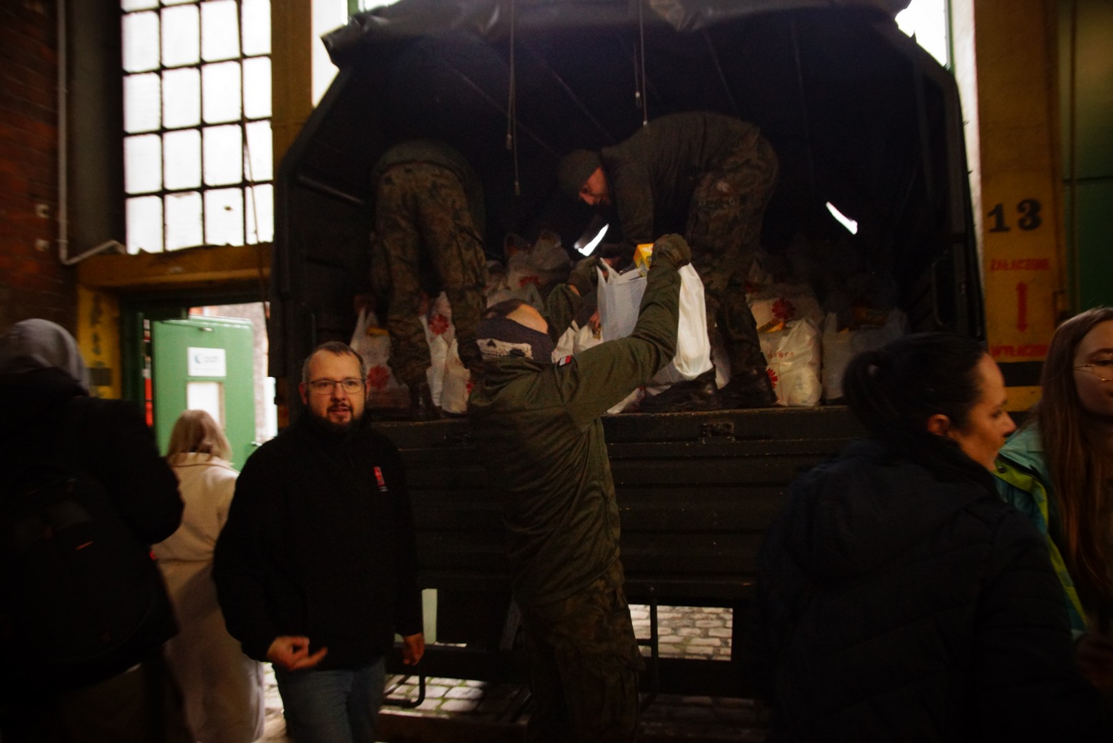 Dzień wcześniej w hali starej zajezdni tramwajowej na Dąbiu paczki zostały przygotowane, przez wolontariuszy Caritas i żołnierzy Wojsk Obrony Terytorialnej.