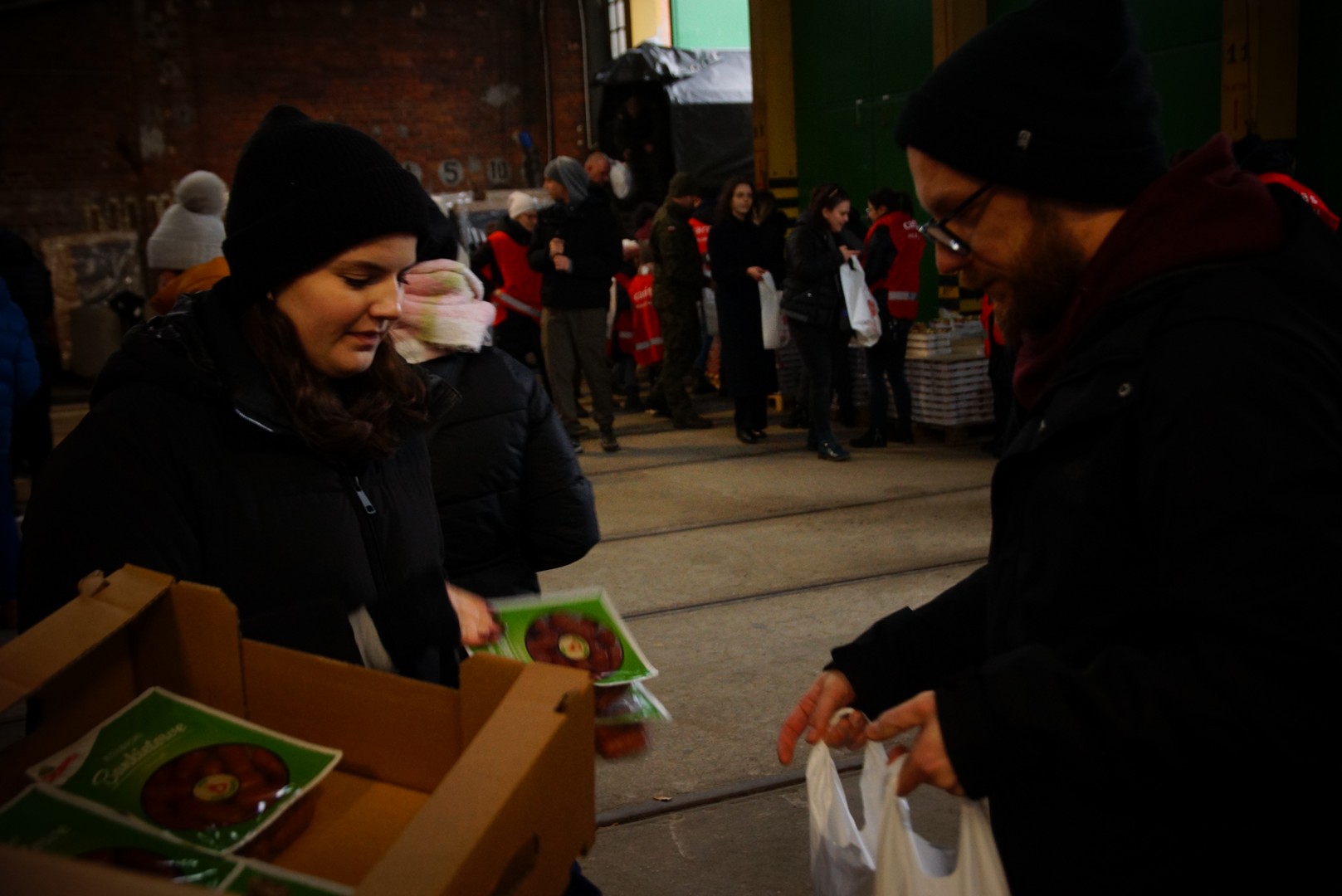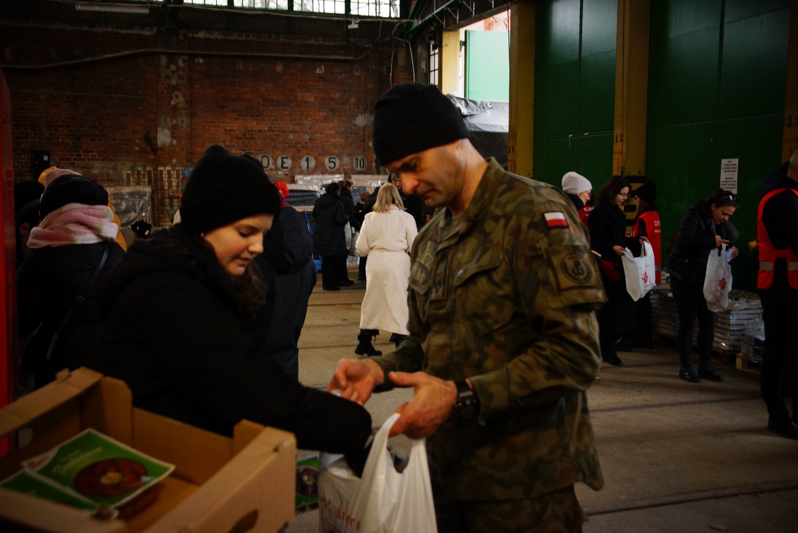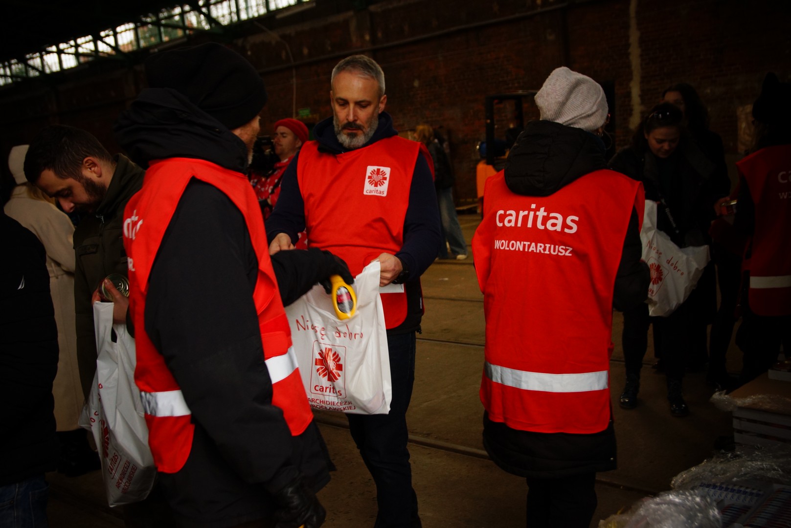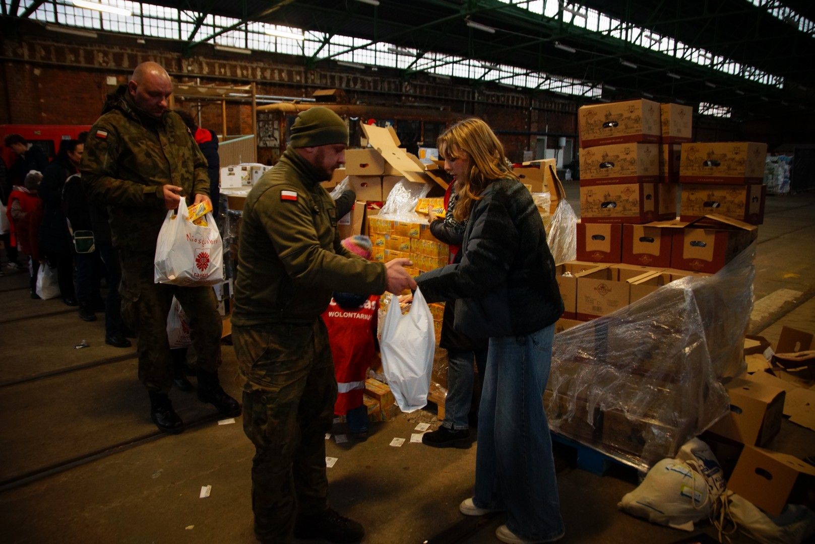 Paczki zostały przygotowane dzień wcześniej w hali starej zajezdni tramwajowej na Dąbiu, gdzie wolontariusze Caritas i żołnierze Wojsk Obrony Terytorialnej pracowali z pełnym zaangażowaniem. Dzięki ich staraniom udało się spakować 1000 paczek.