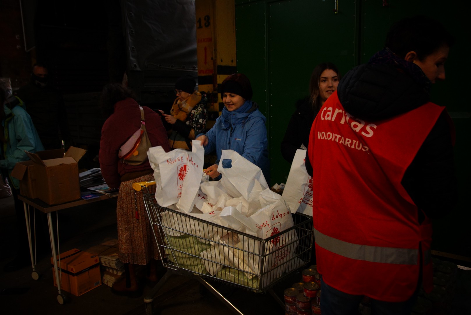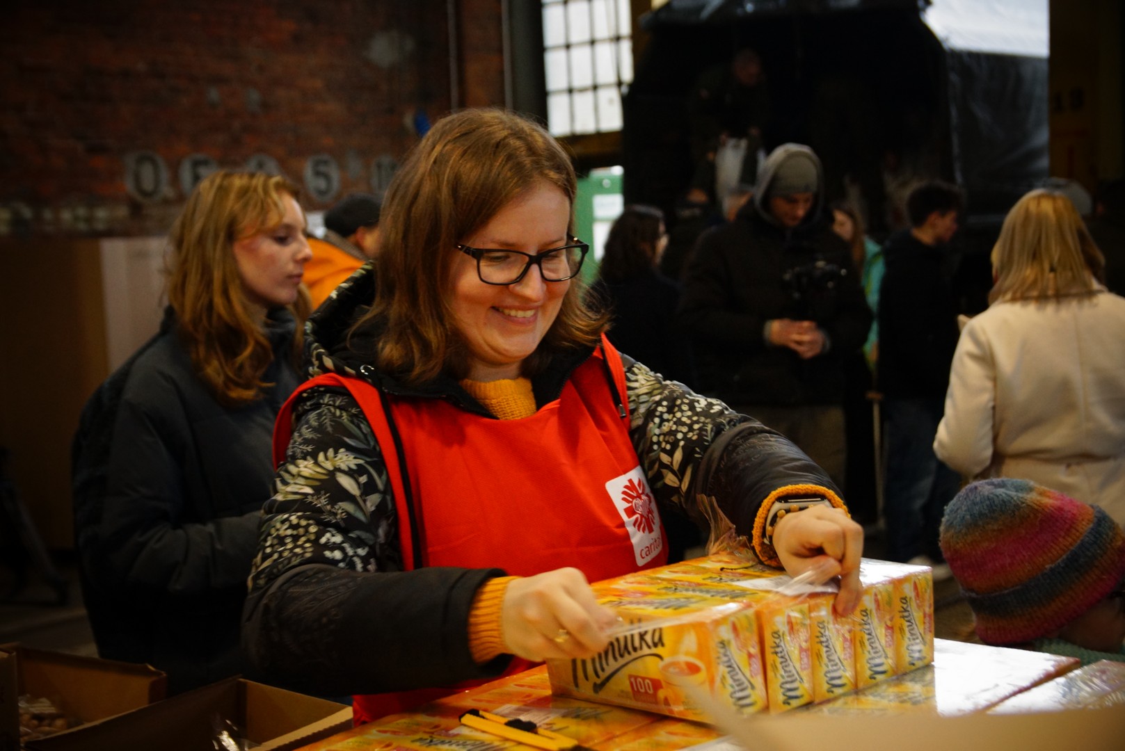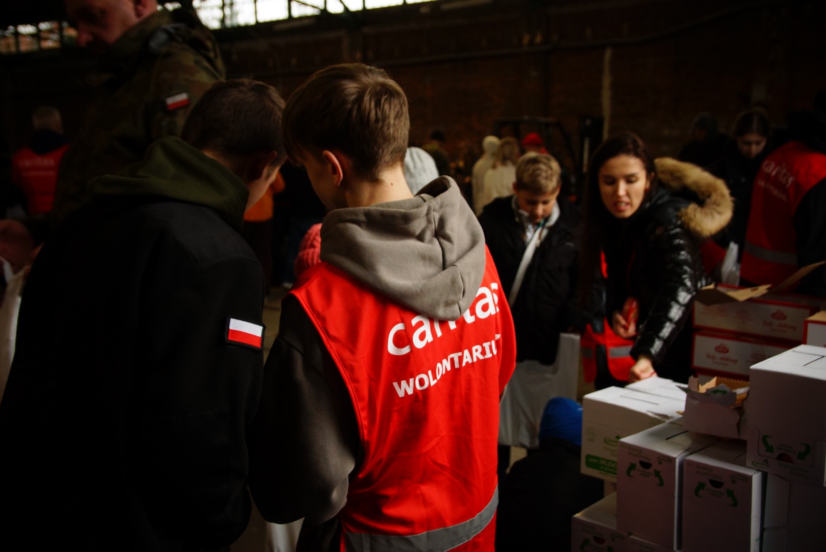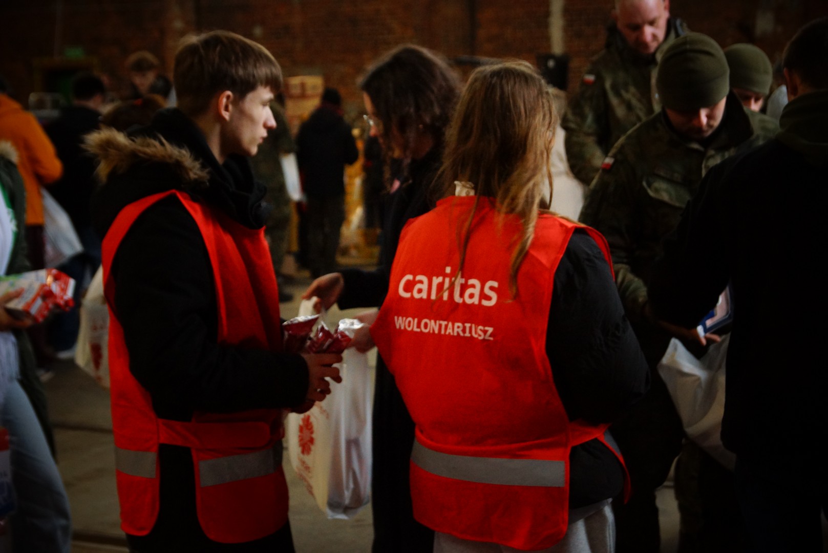 Paczki zostały przygotowane dzień wcześniej w hali starej zajezdni tramwajowej na Dąbiu, gdzie wolontariusze Caritas i żołnierze Wojsk Obrony Terytorialnej pracowali z pełnym zaangażowaniem. Dzięki ich staraniom udało się spakować 1000 paczek.