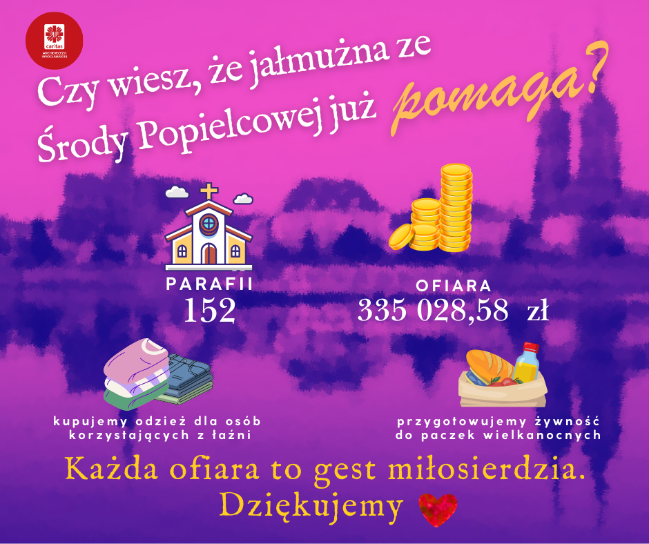 Według stanu na 4 marca wpłaty przekazało już 152 parafii, a łączna kwota złożonej jałmużny wynosi 335 028,58 zł. To konkretny znak solidarności z osobami ubogimi i potrzebującymi, które każdego dnia korzystają z pomocy Caritas.